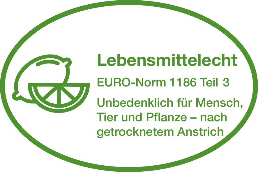 Lebensmittelecht nach EURO-Norm 1186 Teil 5/14 - Unbedenklich für Mensch, Tier und Pflanze (nach getrocknetem Anstrich)Unbedenklich für Mensch, Tier und Pflanze (nach getrocknetem Anstrich) - Geeignet für Kinderspielzeug - Geprüft nach DIN EN 71.3; speichel- und schweißecht