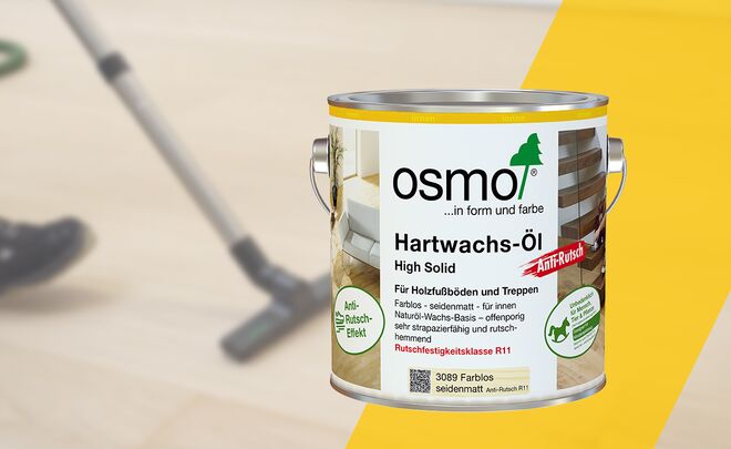 Osmo Hartwachs-Öl Anti-Rutsch ist ideal für den Schutz aller Holzfußböden bei denen eine erhöhte Rutschsicherheit gefordert wird wie Treppen, Theaterbühnen, Laufstegen oder Tanzböden (Objektbereich) aus Massivholzdielen, Landhausdielen, Schiffsböden, OSB- und Korkfußböden oder saugfähigen Holzplattenmaterialien. Auch geeignet für Holzarten wie z. B.: Pitchpine und Schwarzkiefer.