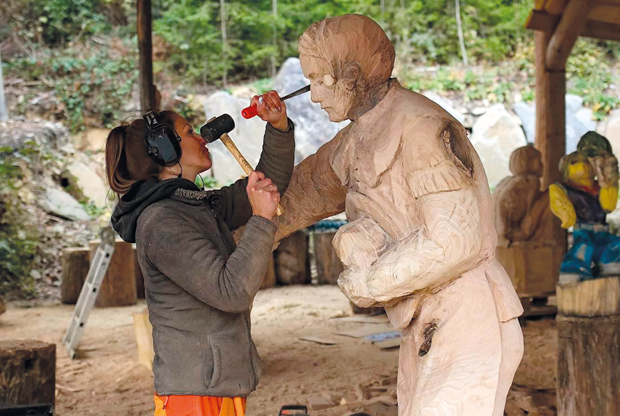 Zum Kettensägenschnitzen kam Res Hofmann 2015, nachdem sie zwei Künstlern bei einer Veranstaltung dabei zugesehen hatte. „Der Lärm, die Kraft, die daraus entstandene Skulptur – das alles hat mich total begeistert!“ Sie startete einen Versuch mit einer ungefährlichen, aber auch schwächeren elektrischen Kettensäge. „Mühselig!“, erinnert sie sich lachend. Erst die Arbeit mit der Motorsäge machte richtig Spaß, denn sie schnitt das Eichenholz wie Butter. Res Hofmann fertigte eine Figur nach der anderen und wurde immer besser und auch bekannter.