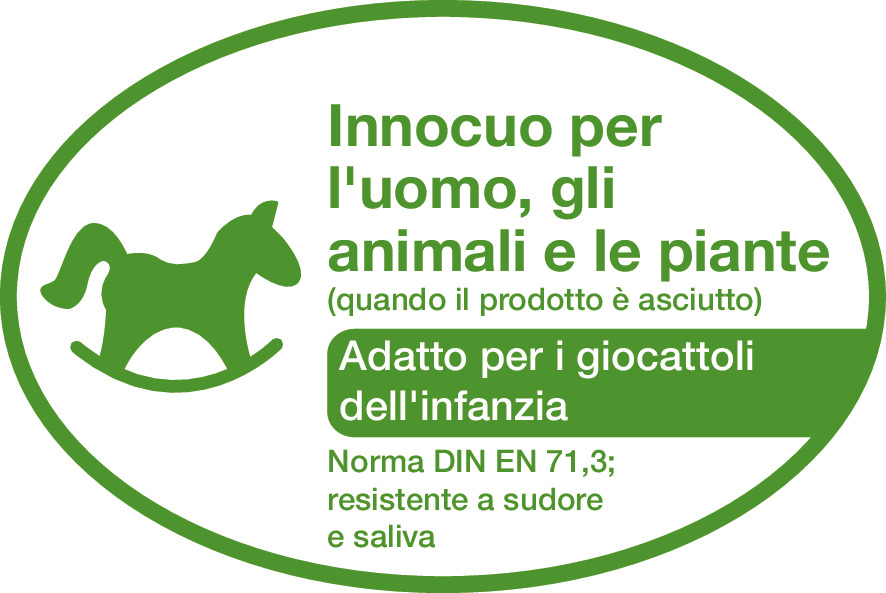 Innocuo per l’uomo, gli animali e le piante  (quando il prodotto è essiccato). Adatto per i giocattoli dell’infanzia, Norma DIN EN 71.3; resistente al sudore e alla saliva.